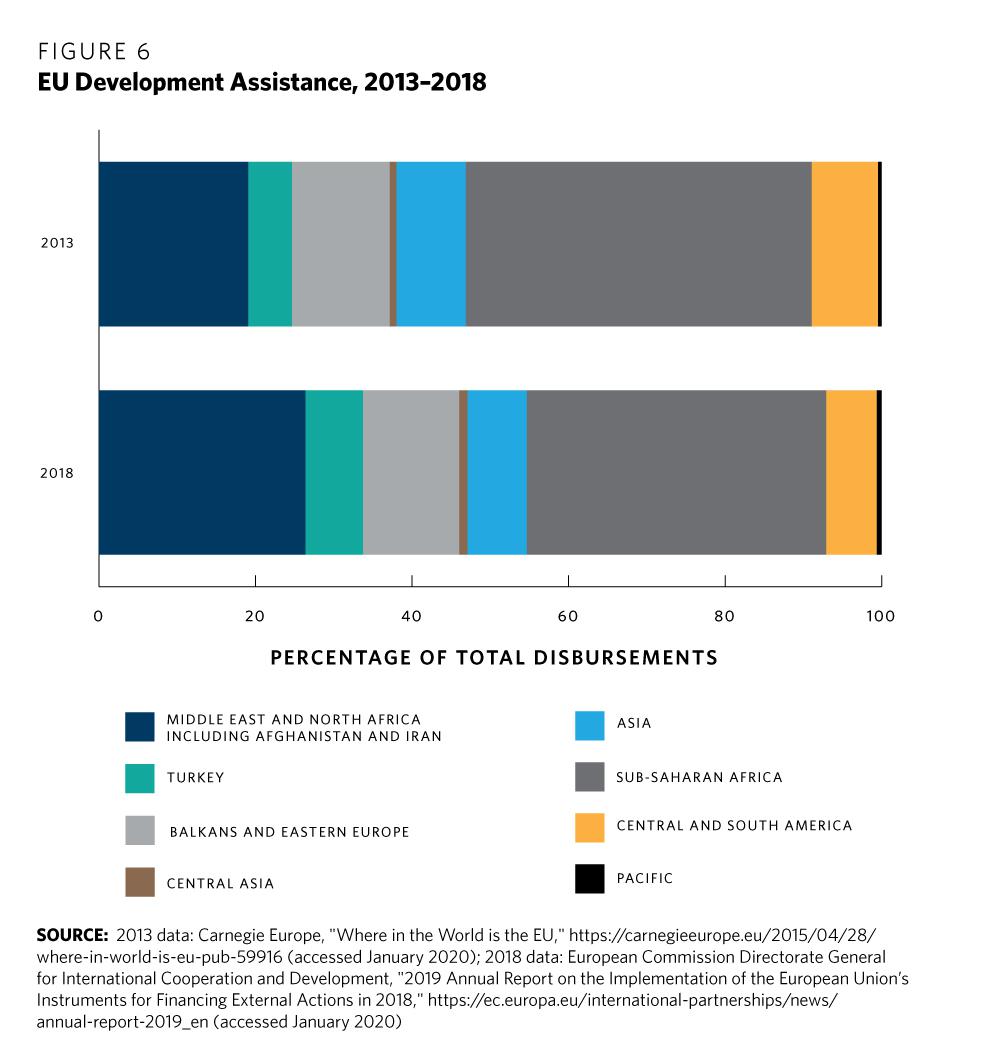 In 2018, the latest year for which data are available, almost 40 percent of total spending went to sub-Saharan Africa (see figure 6). This was followed by the Middle East (26 percent) and the Western Balkans and Eastern Europe (12 percent).