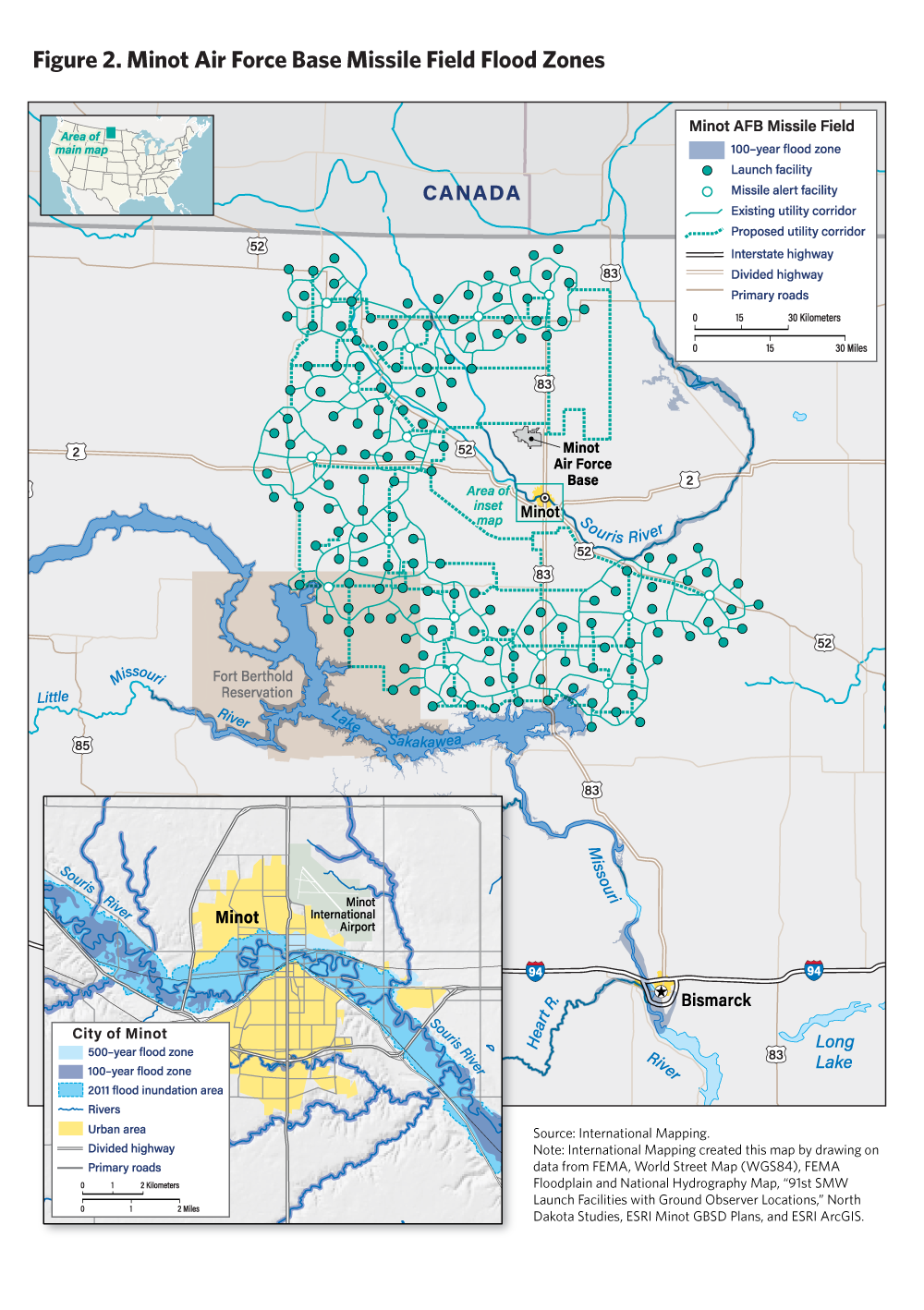 Importantly, even an extremely severe flood is unlikely to make all LFs or MAFs in the Minot missile field inaccessible. Moreover, Minot is one of three air force bases with ICBM facilities; F.E. Warren Air Force Base in Wyoming and Malmstrom Air Force Base in Montana also oversee 150 LFs. All three bases are located in the Missouri River Basin, suggesting a possibility that all of them could be impacted by a particularly wet year, but probably not at the same extremes. More severe flooding is therefore unlikely to fundamentally undermine the ICBM leg’s deterrence mission—to maintain the ability to carry out a prompt and overwhelming strike.84 Relatedly, because control of the collective 450 LFs is distributed among forty-five MAFs across the three bases, such flooding would not likely necessitate any change in the alert status of ICBMs, although decreasing the number of MAFs from fifteen to eight LCs at each base as part of the Sentinel modernization effort presumably concentrates the potential impact of flooding on this collective command and control structure.85